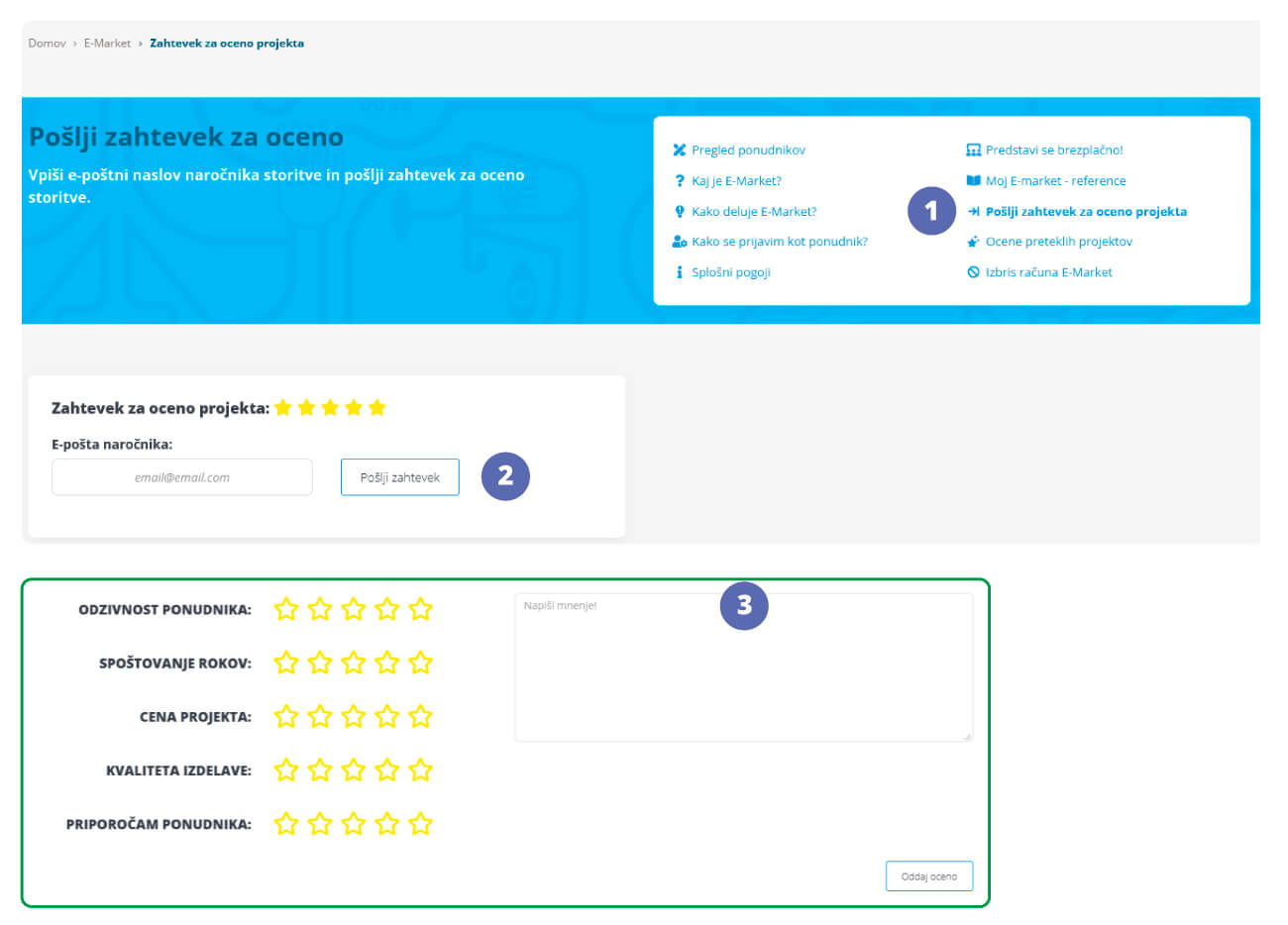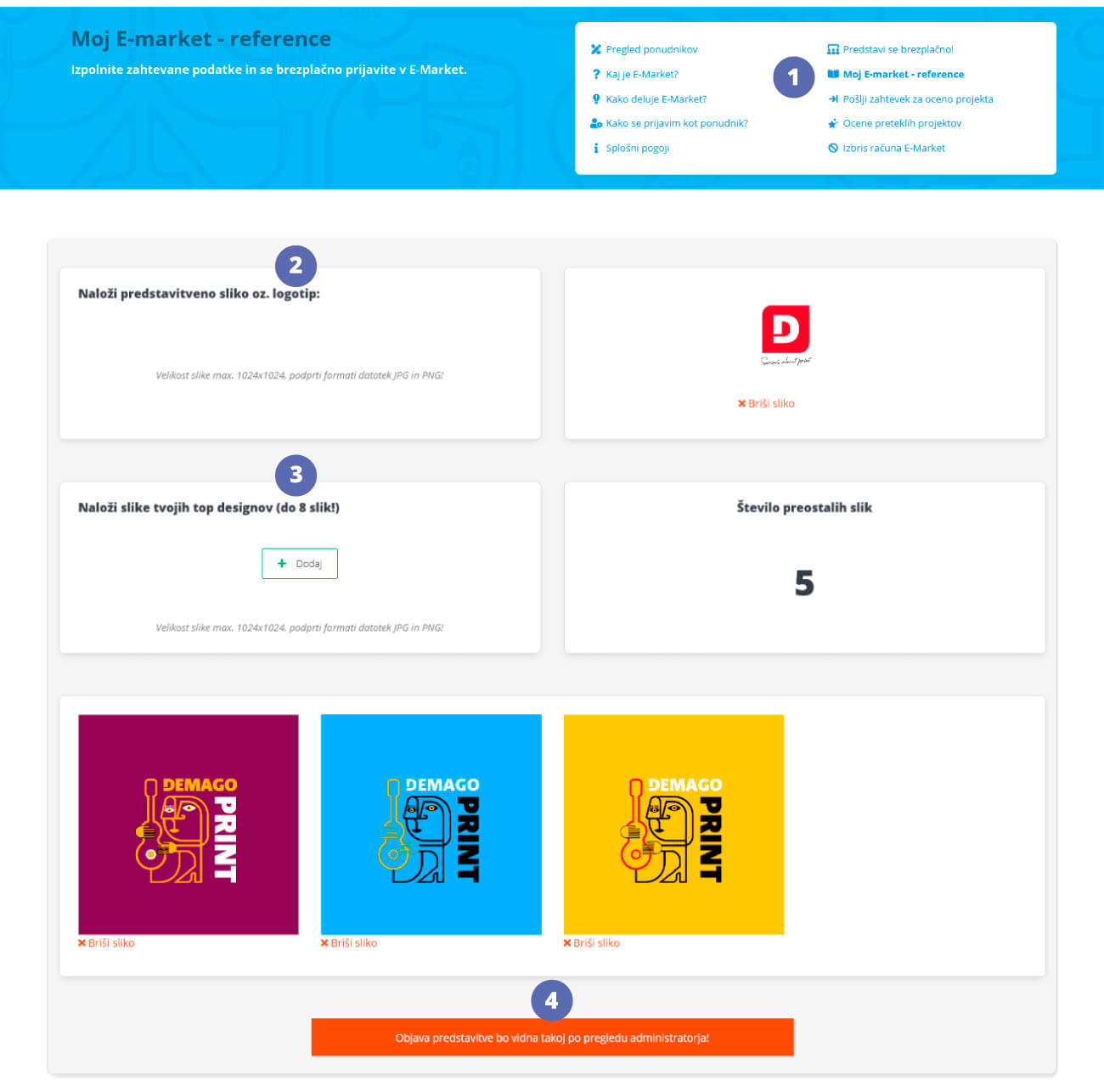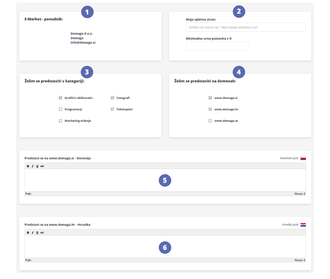 Ako se želite predstaviti u aplikaciji E-Market, prvo se morate registrirati kao novi korisnik.ZZa registraciju novog korisnika slijedite ovu poveznicu: Prijava i ispunite obrazac s traženim podacima.Nakon što dovršite registraciju i budete prijavljeni sa svojim korisničkim imenom i lozinkom kao novi korisnik, slijedite ovu poveznicu.Otvorit će vam se podstranica gdje ćete unijeti tražene podatke:1. E-Market pružatelj usluge:Podaci koje ste unijeli prilikom registracije novog korisnika.2. Moja web stranica i minimalna satnica:Unesite vašu web stranicu na kojoj potencijalni klijenti mogu vidjeti vašu ponudu i okvirnu cijenu koju ćete naplatiti za svoju uslugu. 3. Želim se predstaviti u kategoriji:Na temelju vašeg iskustva označite kategorije u kojima se želite predstaviti.4. Želim se predstaviti na domenama:Online tiskara Demago Print dostupna je i na engeskom i njemačkom jeziku, pa se možete predstaviti široj ciljnoj publici.5. Predstavi se:Ukratko opišite vaše dosadašnje iskustvo. Ako se predstavljate i na stranim domenama, prevedite opise vašeg iskustva na jezik domene na kojoj se predstavljate!6. Opći uvjeti:Pročitajte opće uvjete, označite da se s njima slažete i kliknite na gumb Nastavi.